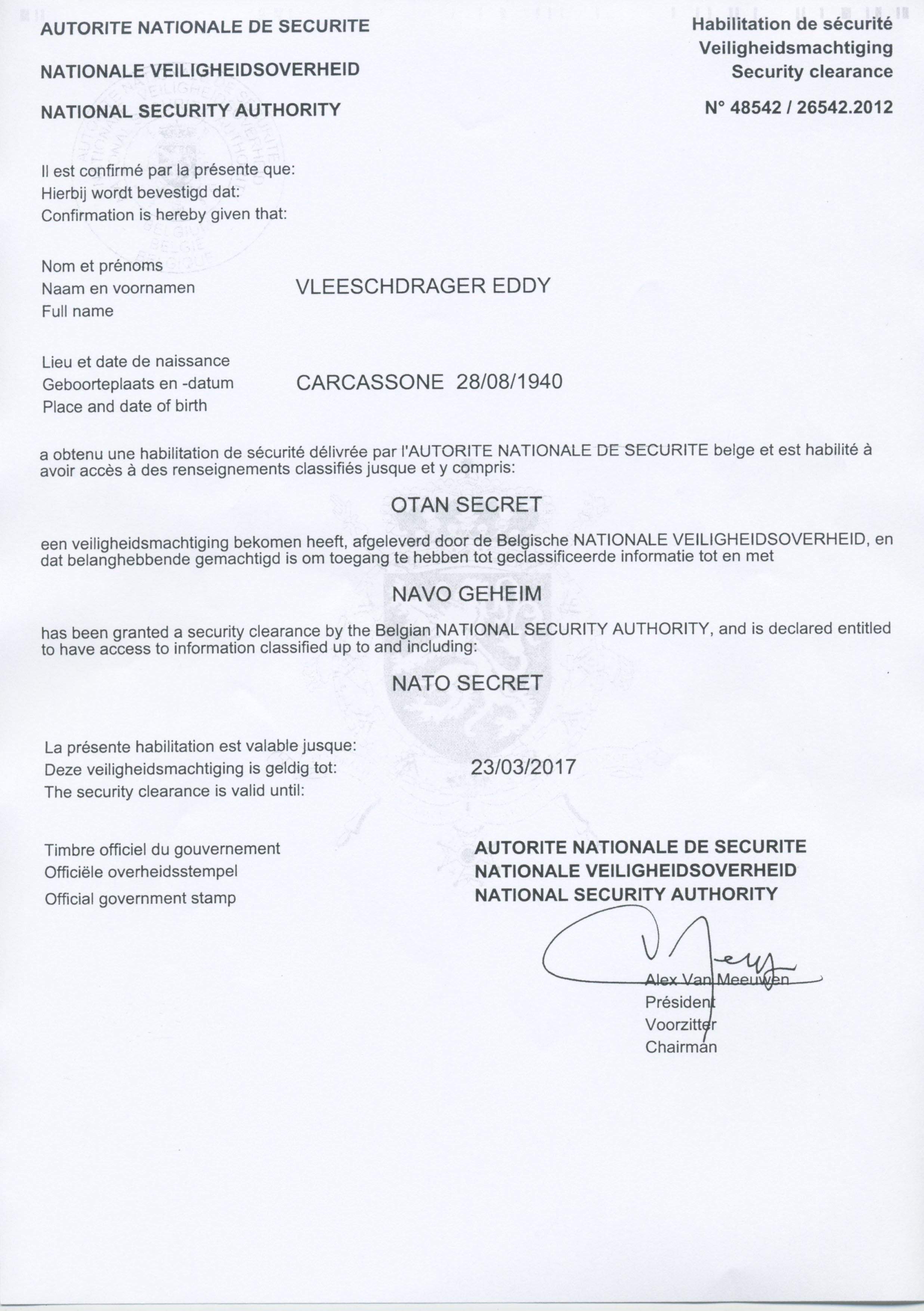 NATO: Security clearance n° 48542/26542.2012